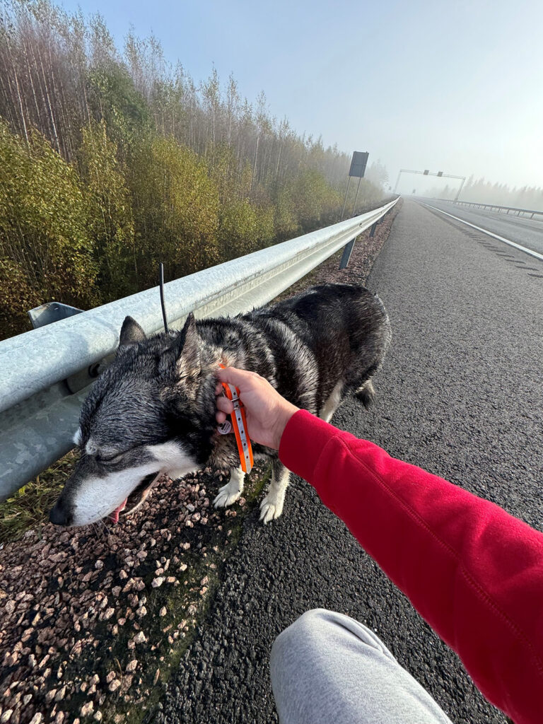 Koiralla oli radiopanta ja lappu, jossa oli puhelinnumero sekä nimi ”Lumi”. Lumi oli osuman autosta, sen takajalat vuoti verta ja koiran takapää ei kantanut painoa. Lievästi riskeeraten omaa henkeäni rauhoittelin koiraa siinä keskellä motaria ja sain sen siirrettyä turvallisempaan paikkaan tien sivuun. Soitin pannassa olevaan numeroon. Omistaja oli kävellen matkalla jotain korvesta kohti autoa ja hakemaan koiraansa. Hänellä olisi kuitenkin tullut kiertomatkaa niin paljon että sovimme että tapaamme seuraavalla moottoritien rampissa. Tänä aikana koira hieman rauhoittui ja pysyi jo pystyssä omin avuin. Nostin läpimärän ja verisen koiran pakettiauton takaosaan ja vein sovitulle paikalle. Omistaja oli kiitollinen ja lähti kiireesti viemään Lumia eläinlääkärille.